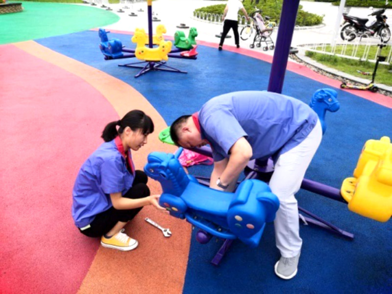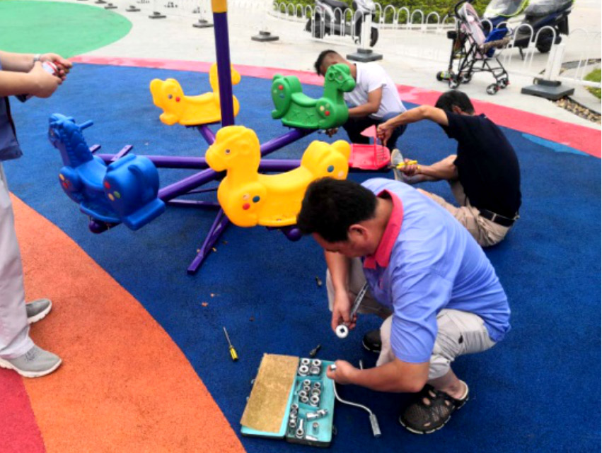 皖维樱花公园的儿童游乐设施安装以后,受到了附近职工住户的青睐,茶余饭后纷纷带孩子过来玩耍。由于设施使用频率高同时长期经受风吹日晒,部分设施出现了零件老化松动的状况。为消除安全隐患,打造个小朋友安心玩耍的场所,8月21日,社区党总支机关党支部房地产公司党小组开展了次特殊的党日活动,对樱花公园儿童乐园内的游乐设施进行完全隐患排查和治理。